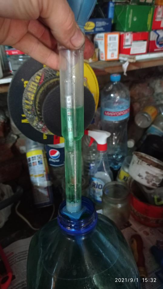 Поплавок кстати упал в бутыль и там как-то ниже показует температуру, чем в ареометре.